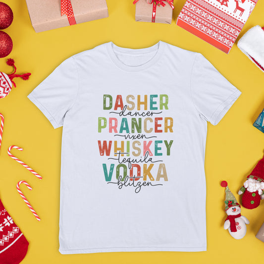Dasher & Dancer Drinking T-Shirt – Funny Holiday Party Tee for Whiskey, Vodka, and Tequila Lovers | Bella + Canvas Unisex Ash Shirt